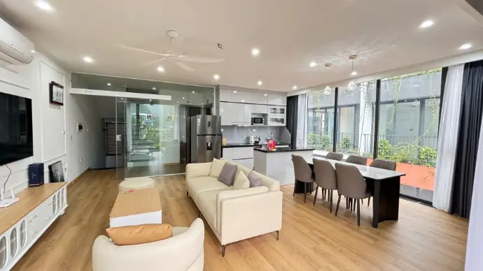 Phòng khách và bếp thiết kế liên thông, rộng, thoáng đãng tại tầng 3 với đầy đủ trang thiết bị.